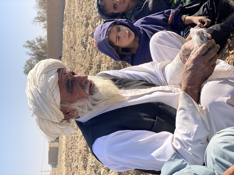 An outdoor scene in Mandisar, Afghanistan, depicts an elderly male and two young females seated on dry, barren ground under bright, clear daylight