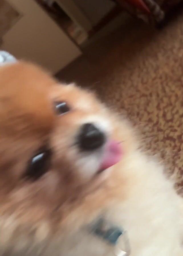 close-up of a small, fluffy dog, likely a Pomeranian, with light brown and white fur