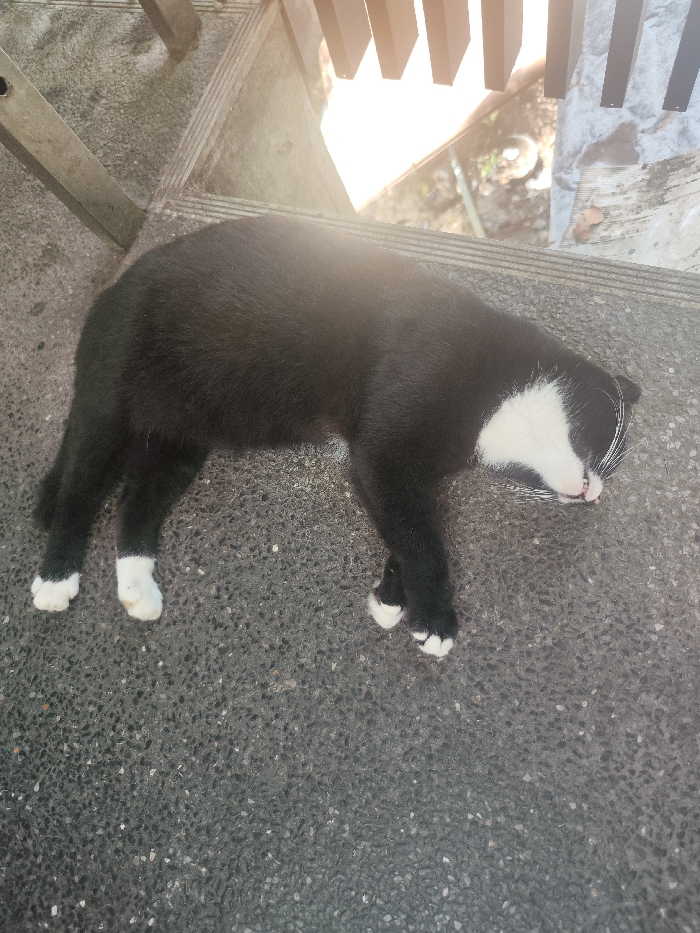 - "In the city of Ratsada, Thailand, an overhead view captures a bicolored feline resting outdoors on a textured concrete surface" by FM-EW4RH2, licensed under CC BY 4.0