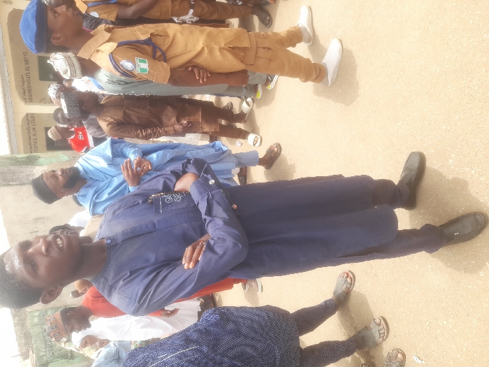 group of men standing on a dirt road in front of a building with a white facade. The man in the foreground, wearing a blue long-sleeved shirt and trousers, has his arms crossed and is looking directly at the camera. He is standing in front of a man wearing a light blue robe, who has his hands clasped in front of him and is looking to his right. There is a white wall with Arabic writing and signs behind the men. The image is taken in Gusau, Nigeria, at latitude 12.165 and longitude 6.679.