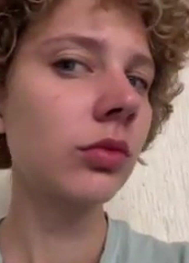 A close-up shot shows a person with short, curly blonde hair and blue eyes looking directly at the camera. Their skin appears pale with a slight redness around the nose and a small red mark on their cheek. They are wearing a light green t-shirt. The background is a textured, off-white wall. The person's expression changes slightly as they subtly smile. There is speech in the background but it is in another language. The camera remains still throughout the short clip.