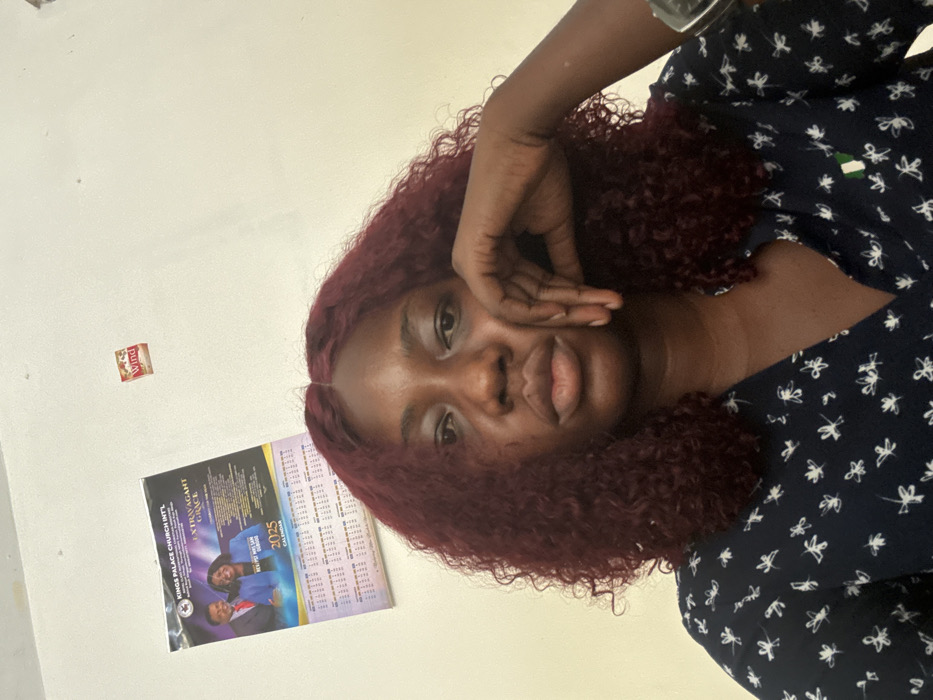 The image displays a headshot of a dark-skinned woman with shoulder-length, curly, reddish-brown hair, parted down the center. She is looking directly at the camera with a neutral expression. Her left hand is raised, with fingers resting against her chin and cheek. She wears a dark blue collared shirt adorned with a light-colored, intricate floral or abstract pattern. A small pin resembling the Nigerian national flag (green and white vertical stripes) is affixed to the right side of her shirt collar. The background is a plain, light-colored wall. Affixed to the upper left portion of the wall is a "KINGS PALACE CHURCH INT'L 2025 CALENDAR" featuring images of a man and a woman identified as "REV. PROPH WILLIAM & PASTOR (MRS) DUMIBI" and the theme "EXTRAVAGANT GRACE." Above and to the right of the calendar, a small rectangular sticker or label marked "Wind" is visible on the wall. The presence of the Nigerian flag pin and the calendar for Kings Palace Church International, an organization known to operate in Abuja, Nigeria, indicates the scene is located indoors within Abuja, Nigeria.