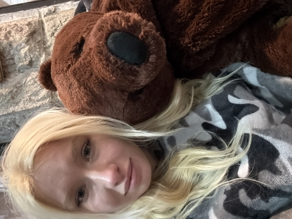 An indoor scene depicts a young woman with long, light blonde hair and a large, brown plush teddy bear