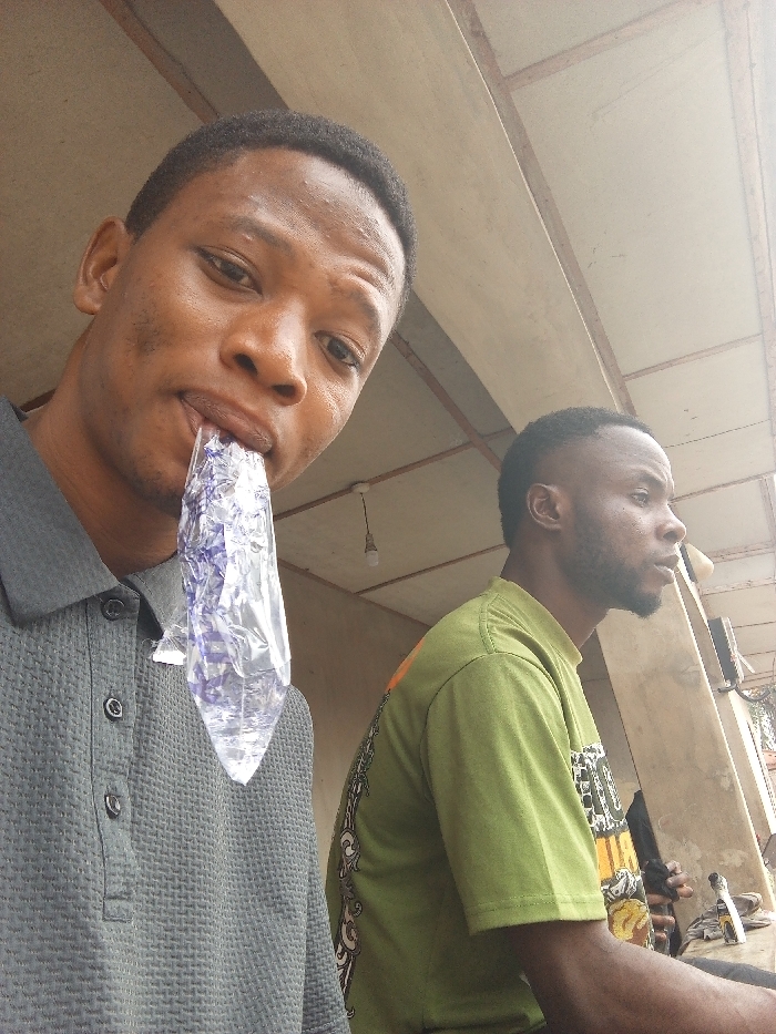 The image depicts two males under a covered outdoor structure. In the foreground, a young adult male with dark, short hair and a dark complexion wears a grey textured polo shirt and looks directly at the camera. He is consuming liquid from a transparent plastic sachet, which is held between his lips. The sachet appears to contain water and has faint blue markings. Behind him and to the right, a second young adult male with dark hair, a faded haircut, and a beard is visible in profile, looking towards the right side of the frame. He wears a light green t-shirt with a graphic design. The background shows a concrete ceiling or overhang with a bare light bulb suspended from a wire, and a vertical concrete pillar or wall section. The location appears to be a casual, sheltered outdoor area, possibly a veranda or an open-air waiting space, in the city of Unknown, Unknown.