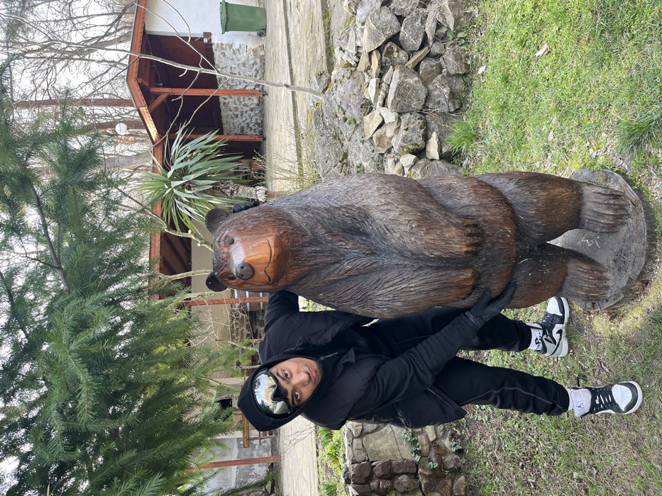 An outdoor scene in Sungurlare, Bulgaria, features a single male individual posing beside a dark brown wooden carving of a standing bear