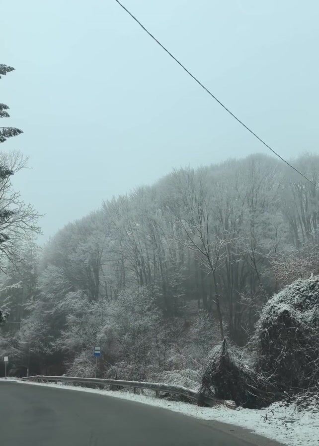 car's perspective driving on an asphalt road through a snowy, forested area. The trees lining the road are covered in snow, and the landscape is shrouded in fog or mist. A bus stop sign is visible on the right side of the road. The sky is overcast and appears to be grey.