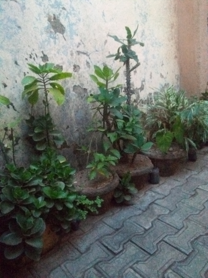 The scene displays a linear arrangement of approximately ten potted plants positioned along the base of a discolored, textured wall within the city of Bukuru, Nigeria