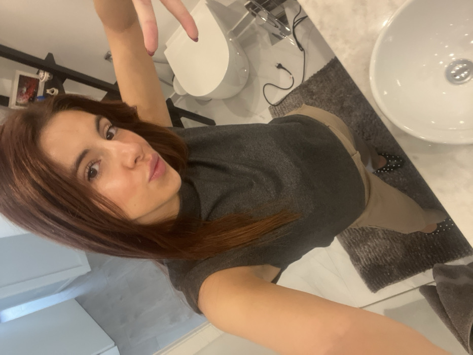 An adult female is captured in a medium-shot selfie, standing in a modern bathroom located in Unknown, Unknown