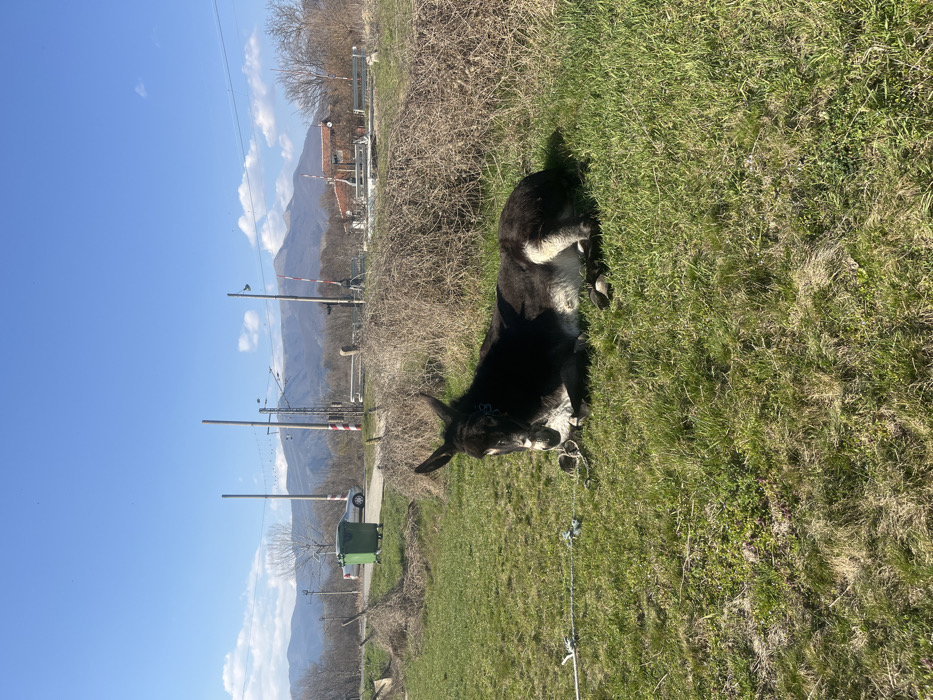 - "A dark-coated donkey, exhibiting white fur on its underside and legs, is observed lying on its left side within a green grassy field" by FM-Z13qd2, licensed under CC BY 4.0