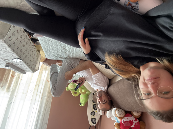 An indoor scene within a residence in Sofia, Bulgaria, captures two individuals in a domestic setting, likely a bedroom or living room. In the foreground, a female with light brown hair and eyeglasses, dressed in a black long-sleeved top and black leggings, lies on a light-colored surface, looking directly at the camera with a slight smile. Her left hand rests on her abdomen. Behind her, positioned further back and to the right, a male with short dark hair and a beard, wearing a white t-shirt and grey sweatpants, sits on a bed or sofa covered with a light teal patterned duvet. He leans against a brown upholstered headboard, holding a dark smartphone in his right hand, and also looks towards the camera. The background wall behind the male is a light terracotta color, adorned with several stuffed animals: a prominent red teddy bear embroidered with "I love you," a smaller white teddy bear, and a green frog-shaped plush chair/toy. A white panel with black patterns is affixed to the wall above the stuffed animals. To the right of the male, a large window covered by sheer white and patterned beige curtains allows bright natural light into the room, obscuring the view outside. A small table, draped with a white tablecloth featuring a subtle patterned design, holds a rectangular white box and a black smartphone or tablet.