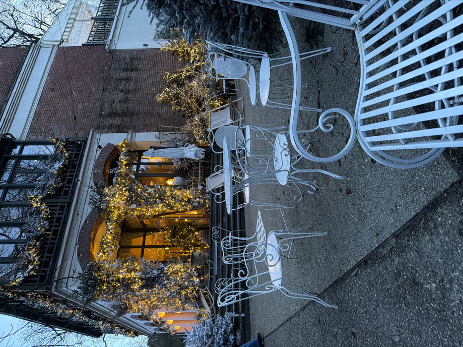 A building facade adorned with festive garlands and lights provides a backdrop for an outdoor cafe setup. Wrought iron tables and chairs, coated in white paint, are arranged on a grey pavement. The tables are set for dining, suggesting a cozy, illuminated atmosphere in an outdoor setting.