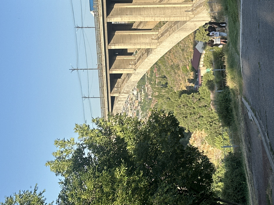 A sideways view showcases a massive concrete bridge spanning a valley with houses. Power lines run parallel above the bridge. Trees and greenery fill the foreground and valley below. A group of people stand near the bridge's edge. A narrow road runs along the right side of the frame. The sky is clear blue.