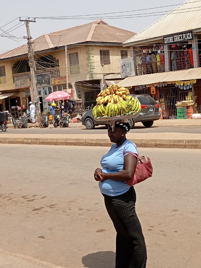An outdoor scene in Bukuru, Nigeria, depicts a commercial street under bright daylight. A dark-skinned woman, appearing pregnant, stands or walks in profile on the left side of the road, facing right. She wears a light blue short-sleeved shirt with pink trim, a dark patterned ankle-length skirt, and gold earrings. She carries a large, overflowing silver-colored metal tray of green and yellow bananas balanced on her head. Her hands are clasped in front of her abdomen, and a red and white checkered shoulder bag hangs from her left shoulder. The background features multiple two-story buildings lining the street. To the left, a light-colored building with a brown corrugated metal roof houses ground-floor shops, one with "I.D.O" visible on its signage. A utility pole with numerous wires stands prominently near this building. Several motorcycles are parked nearby, and individuals are visible near the shops. To the right, another building with a lighter-colored corrugated metal roof displays "DIVINE GRACE PLAZA" on its upper floor, where clothing is visible behind windows. Ground-floor shops below are secured with metal gates, and stacks of bottled beverages are visible outside one. A dark grey SUV is parked on the street in front of this building. The road surface is asphalt or concrete, marked with dirt and stains. A concrete curb separates the road from the buildings. The sky is pale blue and hazy, and strong shadows indicate direct sunlight.