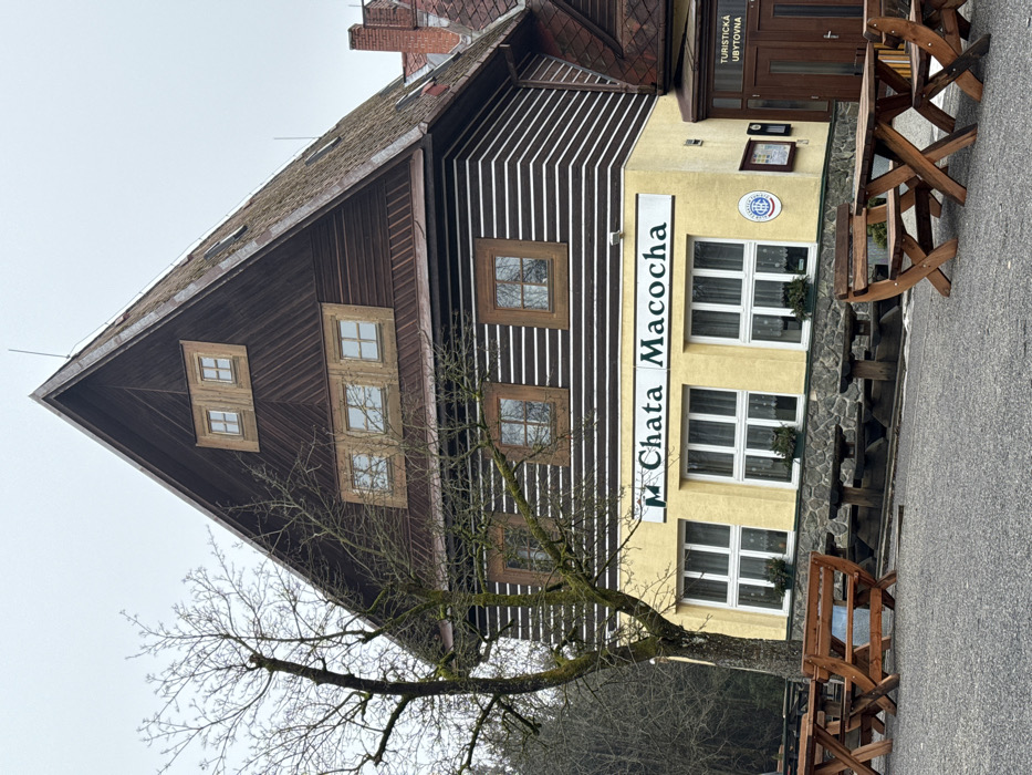This eye-level exterior photograph, captured in Vilémovice, Czechia, presents the "Chata Macocha" lodge under an overcast sky