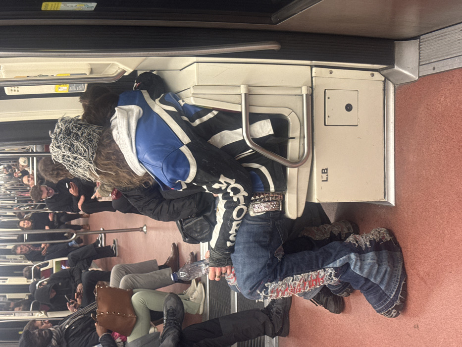 People occupy the seats and stand on a train. One individual, distinguished by their unique style, stands out. They wear distressed jeans, a studded belt, a jacket with bold lettering, and a distinctive hat. The carriage's interior includes beige panels, handrails, and reddish flooring. Other passengers are visible, some looking at their phones.