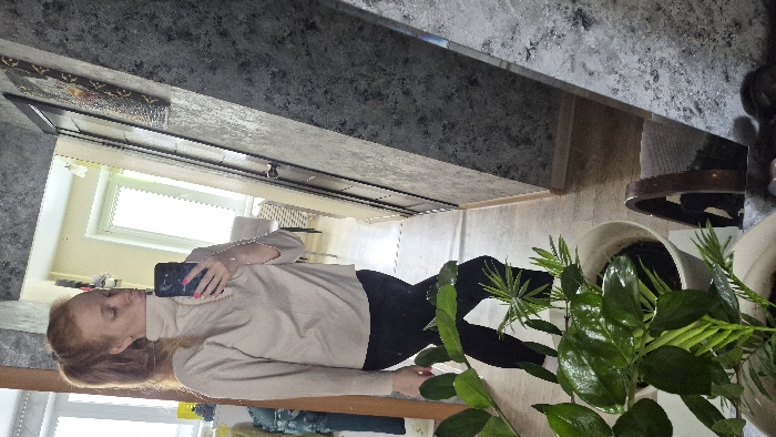 The image depicts an indoor scene in Chaikovsky, Russia, featuring a female individual taking a mirror selfie. The woman, with red hair pulled into a ponytail, wears a light beige long-sleeved top with a high collar and a quarter-zip closure, paired with black leggings. She holds a dark smartphone with a light-colored case in her left hand, its screen obscured, and her fingernails are painted pink. Her lips are pursed in a 'kiss' pose. The large, vertical mirror reflects a brightly lit room behind her, revealing a white-framed window with a radiator below it and a light-colored wall. In the foreground of the actual room, a light-colored floor is visible, on which two potted plants with green foliage are situated, partially obscuring the woman's lower body. To the right of the mirror, a wall covered in dark gray textured wallpaper features a dark door with a doorknob and a framed piece of artwork hanging above it.