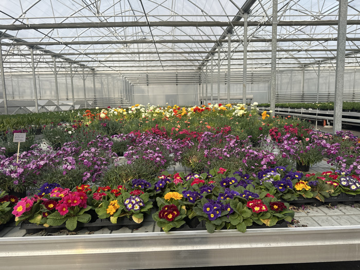 This image displays the interior of a commercial greenhouse located in Bratanitsa, Bulgaria. The structure features a translucent roof and walls supported by a comprehensive metal framework. Elevated slatted metal benches hold numerous rows of flowering plants. In the immediate foreground, primroses (Primula vulgaris) in various colors, including red, purple, yellow, and fuchsia, are arranged in black pots within black plastic trays. The midground contains densely cultivated beds of other flowering plants, predominantly small purple and pink varieties, with additional rows of white, yellow, orange, and red blooms visible further back. A single small, white, stick-mounted sign with dark, illegible text is positioned among the plants in the mid-left. No individuals are present, and no specific actions or interactions are occurring. The greenhouse is brightly lit by natural light filtering through its translucent covering.