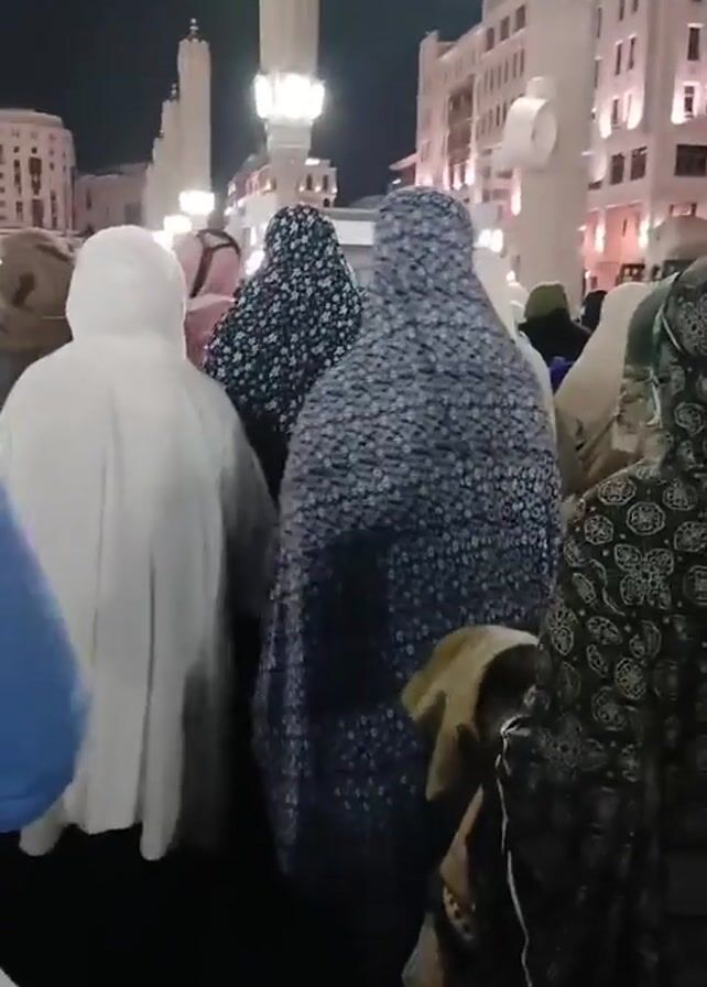 crowd of people, mostly women wearing Islamic clothing, possibly praying outside. The women are wearing various colors and patterns of loose clothing that covers their heads and bodies. The camera is positioned behind them, offering a view of their backs. In the background, there are large buildings lit up and tall, white pillars with lamps on top. It appears to be nighttime. The overall impression is of a religious gathering or pilgrimage in an urban environment.