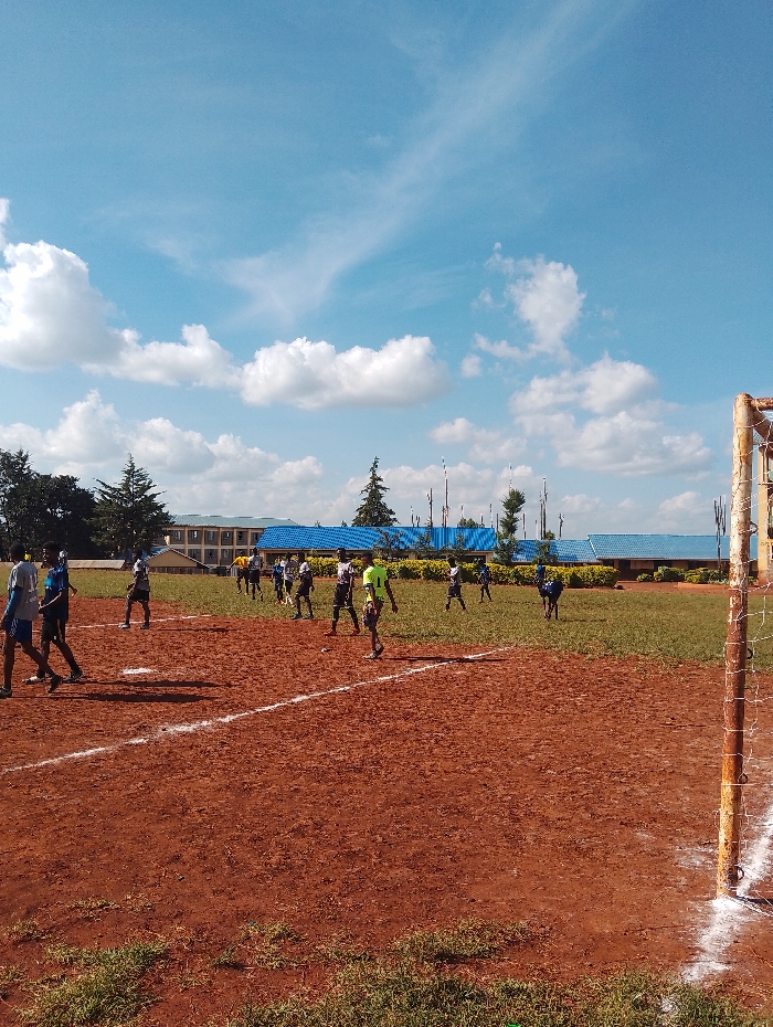 group of boys playing soccer on a dirt field. They are wearing various jerseys, including red, blue, and yellow. The field is bordered by a green grass area, and behind that, a blue-roofed building and a few trees. The sky is blue with scattered white clouds. The boys are running around and interacting with each other as they play. There are also a few other players in the background. The coordinates provided correspond to a location in the town of Rungiri, Kenya. The image appears to have been captured during the daytime, possibly in the late afternoon or early evening. The boys are playing a friendly game, and it appears that the players are all young teenagers. There is a soccer goal in the lower right corner of the image. The field is dusty and dry, which suggests that it may be the dry season. The boys are playing with a lot of enthusiasm, which is reflected in the energy of the image. The overall scene is peaceful and relaxed, which is typical of recreational soccer games in Kenya.