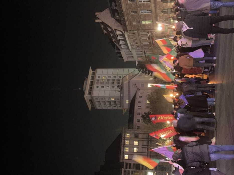 A nighttime image depicts a large gathering of individuals in a public square identified as Place de Bordeaux in Strasbourg, France. The prominent Tour de l'Europe, a multi-story white building characterized by a wide, flat roof and a slender antenna extending from its peak, is visible in the background, its windows illuminated. In the foreground and midground, numerous people are assembled, many holding and waving flags. Predominant flag designs feature red, white, and green horizontal stripes with a central yellow sun emblem. Other flags appear red with white text. Several individuals are actively holding flaming torches, which contribute to the ambient illumination. The ground surface of the square is paved. Additional urban buildings, some with illuminated windows, flank the Tour de l'Europe, completing the nocturnal street scene.