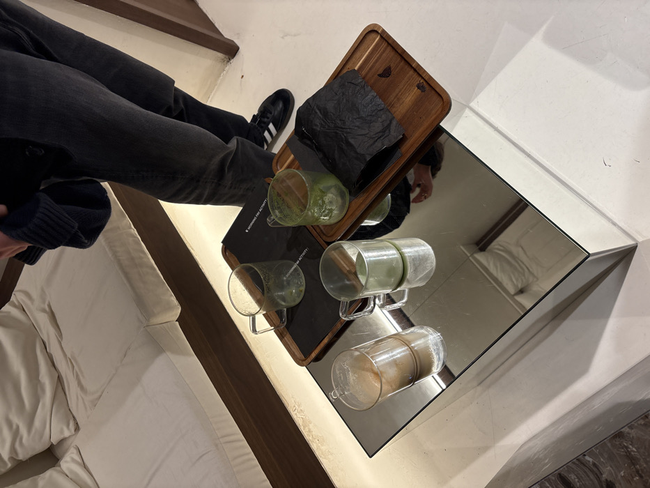 The image captures an indoor scene, likely a cafe, lounge, or hotel interior, characterized by a minimalist aesthetic. In the foreground, a reflective, mirrored coffee table displays four clear glass mugs. One mug on the left contains a light brown liquid, while another, positioned centrally, holds light green residue and a brown stick, possibly cinnamon. A rectangular wooden tray rests diagonally on the mirrored table, presenting two additional clear glass mugs, both with light green residue. Also on this tray are a crumpled piece of black paper or fabric and a black document or menu with text including "MORNING FAV ACTIVITY" and "SCREAMROOM ACTIVITY." To the left and background, a low-slung daybed or couch with white cushions is visible, supported by a dark wooden base, with an LED strip light providing illumination underneath. On the right side of the frame, a person is partially depicted from the waist down, wearing dark grey jeans and black Adidas sneakers with white stripes. Their hands are seen holding a dark blue knitted garment. The precise location within the city of Paris, France, cannot be determined from the visual evidence provided.