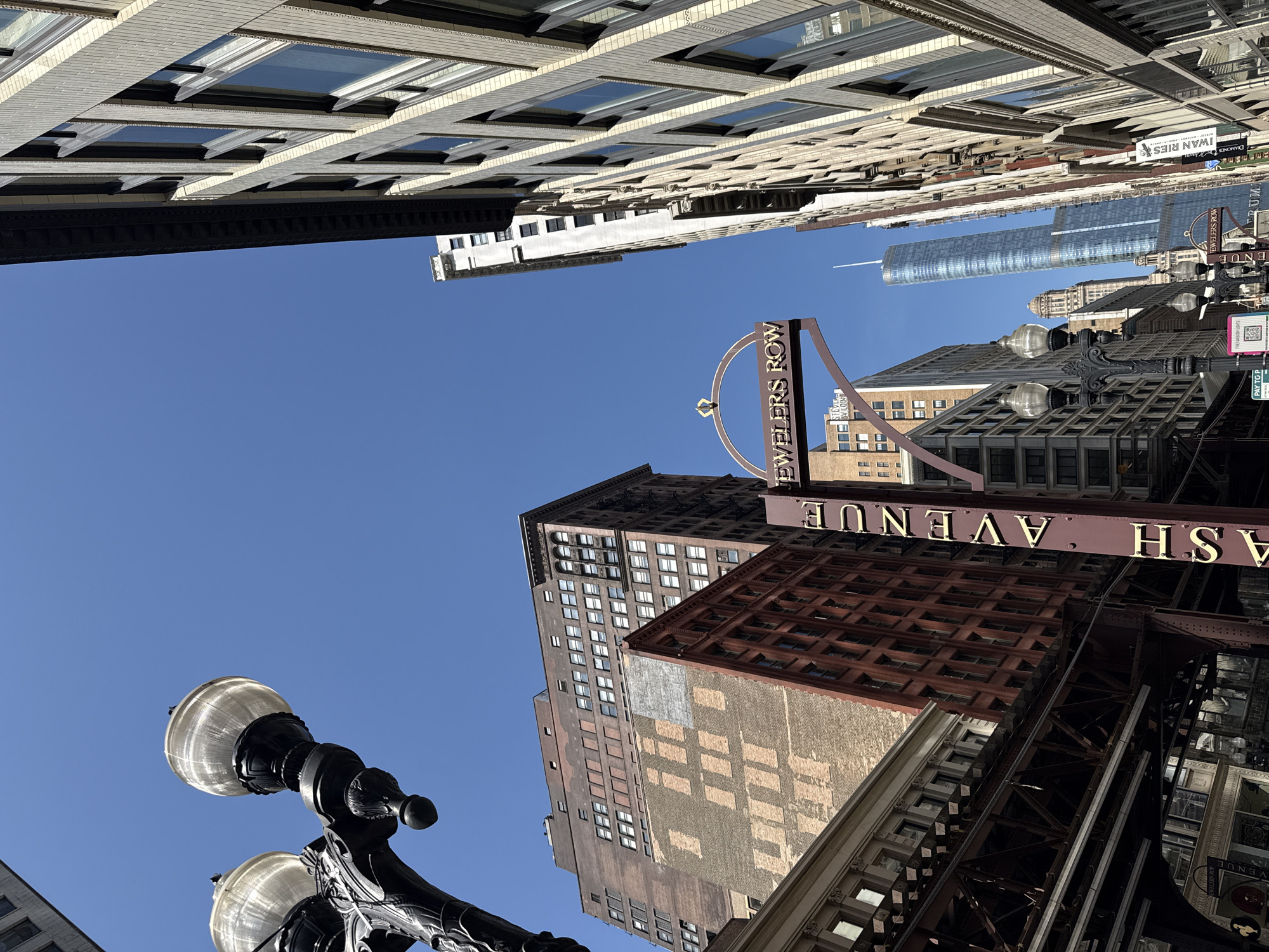 The image captures a street view in Chicago, United States of America, specifically along Jeweler's Row on Wabash Avenue. The perspective is looking upwards, showcasing the tall buildings that line the street, typical of urban environments. Signage for "Jeweler's Row" and "Wabash Avenue" are prominently featured. A vintage-style lamppost with globe lights is visible. The sky is clear and blue, suggesting a sunny day.
