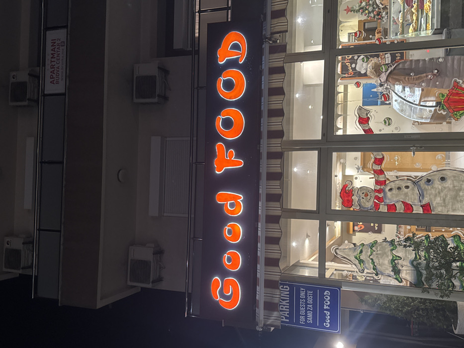 A vertically-oriented sign reading "Good FOOD" in bright orange letters is illuminated at night. To the left, a building has multiple air conditioning units and a sign for "APARTMANI BUDVA CENTAR 2." To the right, window displays feature Christmas decorations, including a snowman and a tree. Below the "Good FOOD" sign is a blue sign that reads "PARKING FOR GUESTS ONLY SAMO ZA GOSTE" and repeats "Good FOOD."