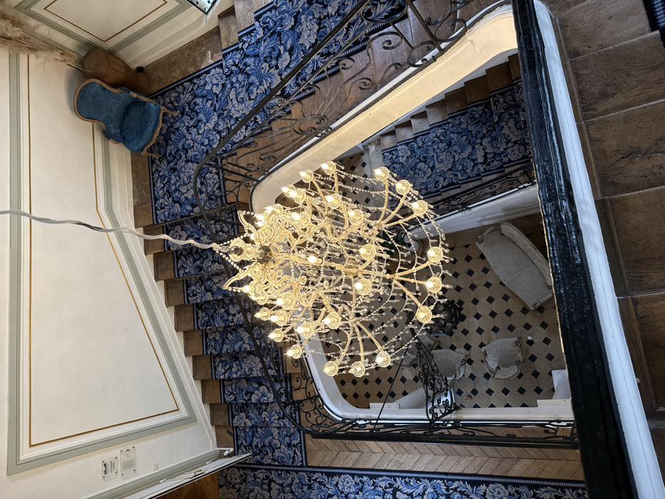 An overhead view captures a multi-level interior staircase in Vexin-sur-Epte, France. Dominating the center is a large, illuminated crystal chandelier, hanging above the main landing. The staircase features blue patterned carpeting with a white floral or foliate design on its treads and risers, contrasting with visible light brown steps or floor edges. An ornate dark wrought iron balustrade with a white handrail curves along one side of the descending stairs. At an upper landing to the top right, a blue upholstered armchair with a light wooden frame is positioned next to a tall, woven basket containing dry, light-colored foliage. The floor in this area is a light-colored stone or marble. To the top left, an upper wall section exhibits white paint with decorative light green and gold trim. A small white sign with black text and an arrow is mounted on this wall. The lower landing or ground floor features a tiled surface with a black and light-colored diamond pattern. On this landing, two light-colored armchairs and a small light-colored sofa are present. The immediate foreground, where the image is captured from, shows dark wooden floorboards. No individuals are present in the scene, and no actions or interactions are depicted.