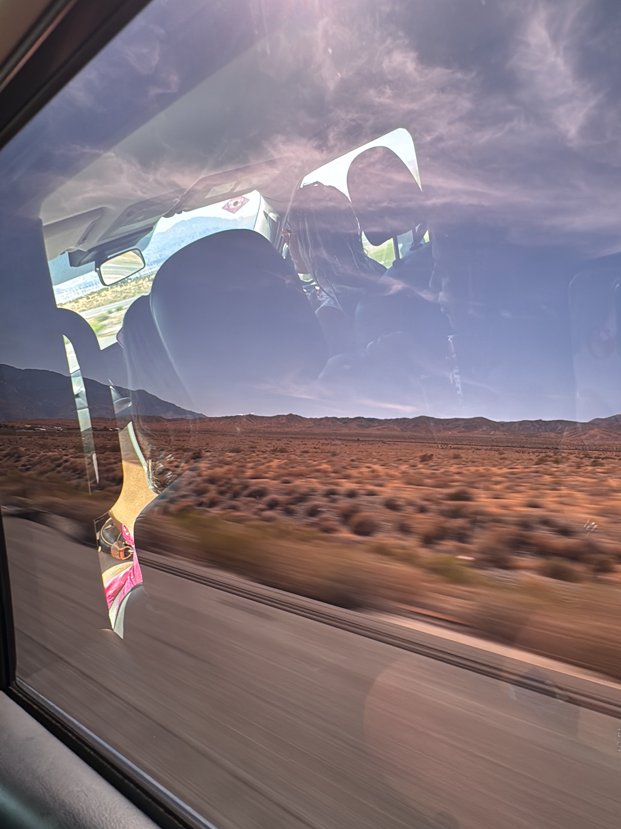 The photograph shows a view from inside a car moving through a desert landscape. The interior of the car is reflected in the window, showing the back of the driver's seat, the headrest, and the rearview mirror. A person is partially visible in the reflection as well. The landscape outside the window consists of a straight road running through a desert environment with sparse vegetation and distant mountains. The sky is visible above, with a mix of blue and light clouds. The blurring suggests the car is in motion. The city of Desert Hot Springs, United States is not directly identifiable from the image.