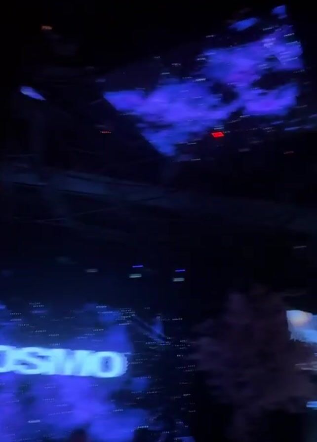 inside of a club or event space, with a focus on the ceiling and some of the crowd. The ceiling has a complex structure, possibly scaffolding or a framework, with multiple screens displaying what appears to be a night sky effect with clouds and stars in shades of blue and purple. The word "OSMO" is lit up in white on a screen, with the same night sky effect in the background. There are spotlights illuminating the space, with beams of blue and yellow light moving around. The camera angle is low, looking upwards. A few people can be seen in the foreground, partially visible and mostly out of focus. There are also what appear to be cherry blossom branches in the right corner of the frame. The video appears to be taken during an event with music playing in the background. The overall atmosphere is dark and energetic.