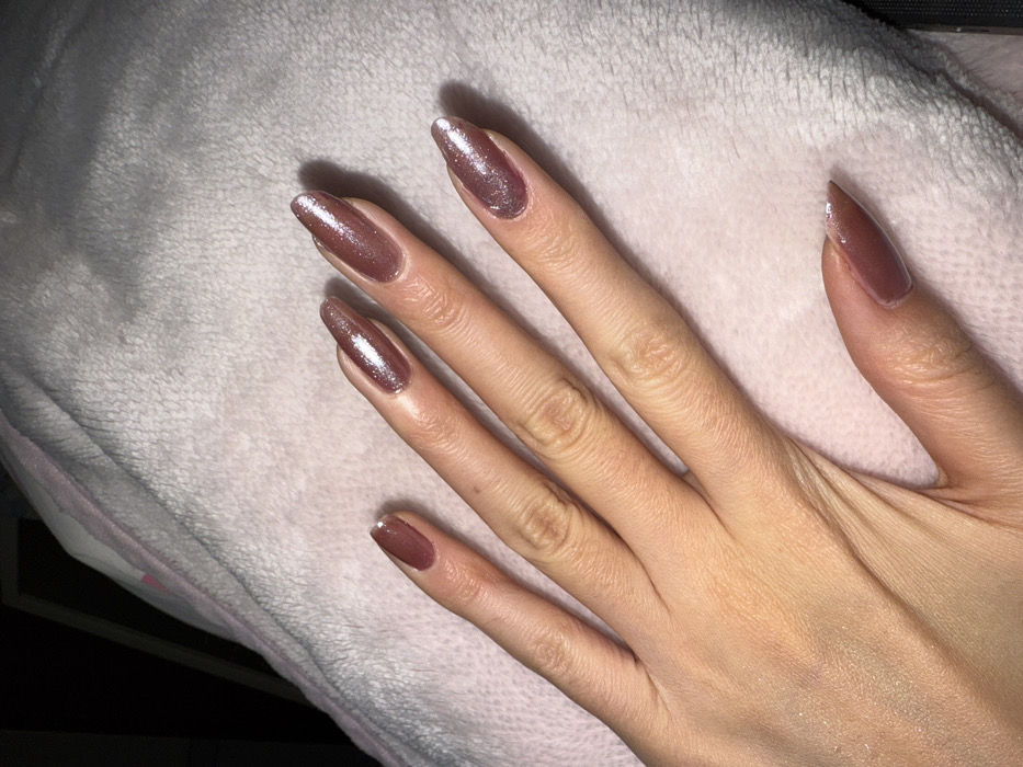 A woman's right hand rests on a soft, pink textured surface. Her fingers are adorned with long, almond-shaped nails painted in a shimmering, mauve-brown color. Light reflects off the surface of the nails, creating a glossy effect, particularly on the thumb and index finger. The skin is fair and taut, with subtle wrinkles on the knuckles. The overall impression is elegant and well-groomed.