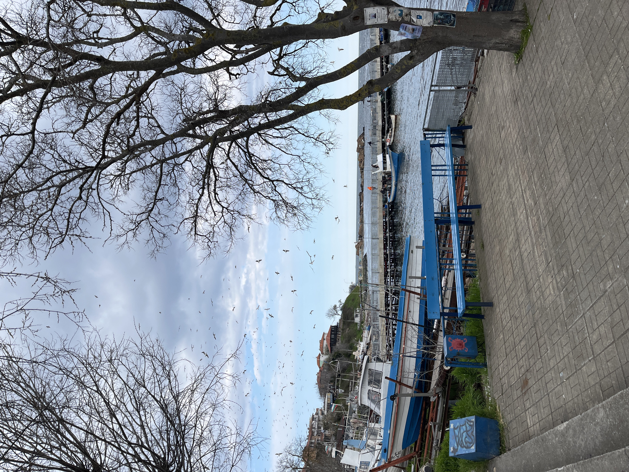 The image depicts a seaside scene in Ahtopol, Bulgaria. A flock of birds flies in the sky above a collection of boats on land, with the sea and a pier in the background. Two leafless trees frame the image on either side. On the right, a paved pathway leads to the water, with blue benches and blocks next to boats and vegetation. The buildings in the background are consistent with the architecture of the city.