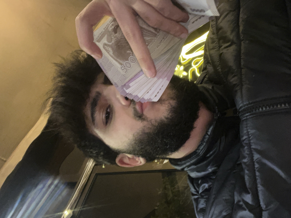 A person with dark hair and a beard holds a thick stack of 500 denomination banknotes near their mouth. They wear a black puffer jacket. The background features a window and a blurry light fixture. The image is taken at an unusual angle, tilting the subject. The banknotes are the focal point, held prominently.