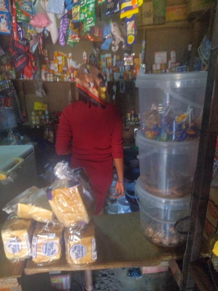 woman in a red dress standing in a small shop in Tuoniako, Nigeria, at the coordinates 7.462 latitude and 7.156 longitude. The shop is crowded with shelves filled with various goods, and the walls are lined with colorful plastic bags containing various products. The woman appears to be talking to someone off-camera. In front of her are four loaves of bread in plastic packaging and three clear plastic containers stacked on top of each other, filled with what appears to be candies, cookies, and nuts. There is also a white refrigerator in the background, and the floor is covered in dirt and debris. The shop appears to be dimly lit.