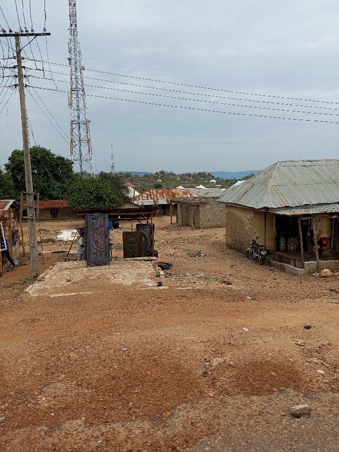 dirt road leading up to a cluster of houses in Kuroko, Nigeria, located at coordinates 7.663, 6.707. The houses are made of brick with corrugated metal roofs. In the foreground, two doors lie on the ground. There is a single person in the distance, standing near one of the doors. There is a tall radio tower in the background. The sky is overcast. The ground is covered in a layer of reddish-brown dirt and gravel. There are several electrical wires running across the scene. There is a motorcycle parked in front of a small, open-fronted shop on the right side of the image.