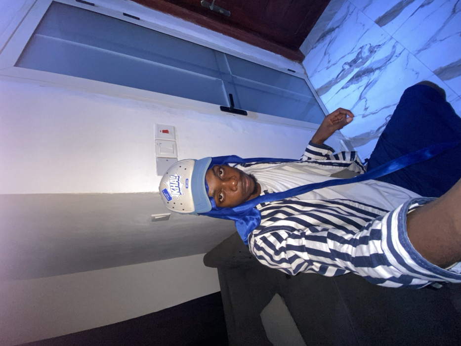 A young man lies on a gray sofa, wearing a striped shirt, blue pants, and a light blue durag under a baseball cap