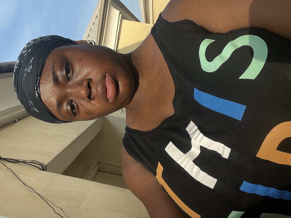 A woman with a black patterned headscarf and black tank top poses from a low angle. Her skin appears to be gleaming in the sunlight. She has a piercing in her left nostril and an earring in her left ear. The tank top has colorful abstract designs, likely letters or shapes. The background consists of a cream-colored building and a blue sky.