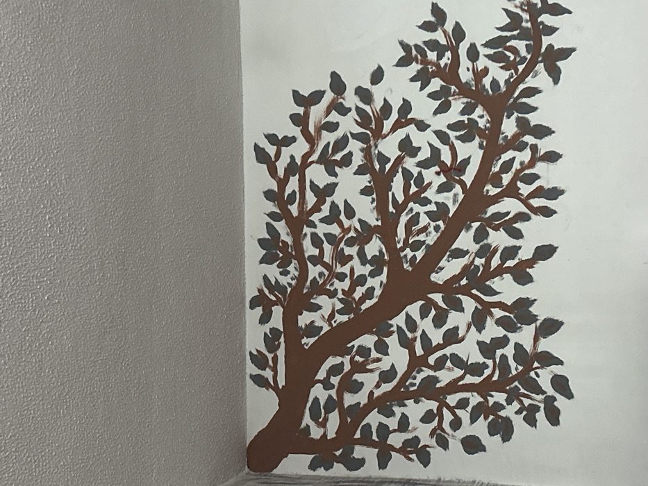 An interior space in Limassol, Cyprus, is depicted, showing a wall and ceiling corner. The upper section of the image reveals a textured, light grey/beige ceiling. Below, a white wall features a hand-painted mural. This mural portrays a tree branch, rendered in a medium brown color, originating from the top-left corner where two walls and the ceiling intersect. The branch extends diagonally downwards and to the right, proliferating into numerous smaller limbs. These limbs are densely adorned with small, ovate leaves, painted in a dark grey or blue-grey hue, with visible brushstrokes. No individuals, actions, or specific movable objects are present in the scene.
