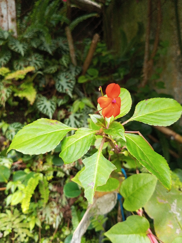The image displays a close-up view of a flowering plant located in Mindat, Myanmar. The central subject is a single, vibrant orange flower with five discernible petals and a visible pinkish-yellow reproductive structure at its center, situated atop a reddish-brown stem. Several elongated, ovate, bright green leaves emanate from the stem, with some exhibiting minor brown discoloration or spotting. The background consists of dense, blurred green foliage, including patterned leaves (possibly Begonia species) with light green designs on a darker green base, visible predominantly in the upper left. Ferns are also present in the upper left. A vertical, dark, indistinct object, possibly a tree trunk or wooden stake, is visible in the upper right background, along with hints of a grey, textured surface, possibly a wall or stone. A faint blue cord or string is partially visible intertwined with foliage in the lower right background. No people or animals are present.