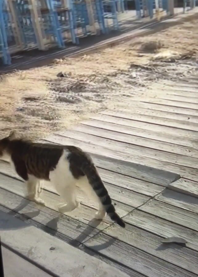 brown and white cat walking across a wooden deck and onto a patch of sandy ground with scattered grass and debris. In the background, there are several rows of blue and white chairs and tables, covered by a large white umbrella. Beyond that, a body of water is visible with mountains in the distance and a large ship on the water. The camera follows the cat as it moves away from the deck.