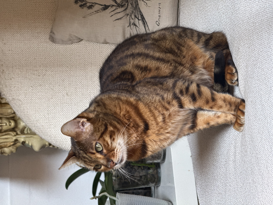 - "A Bengal cat, displaying a prominent warm brown and dark striped/spotted coat pattern with green eyes, is depicted sitting upright on a light-colored, textured upholstered surface" by FM-17PKw1, licensed under CC BY 4.0