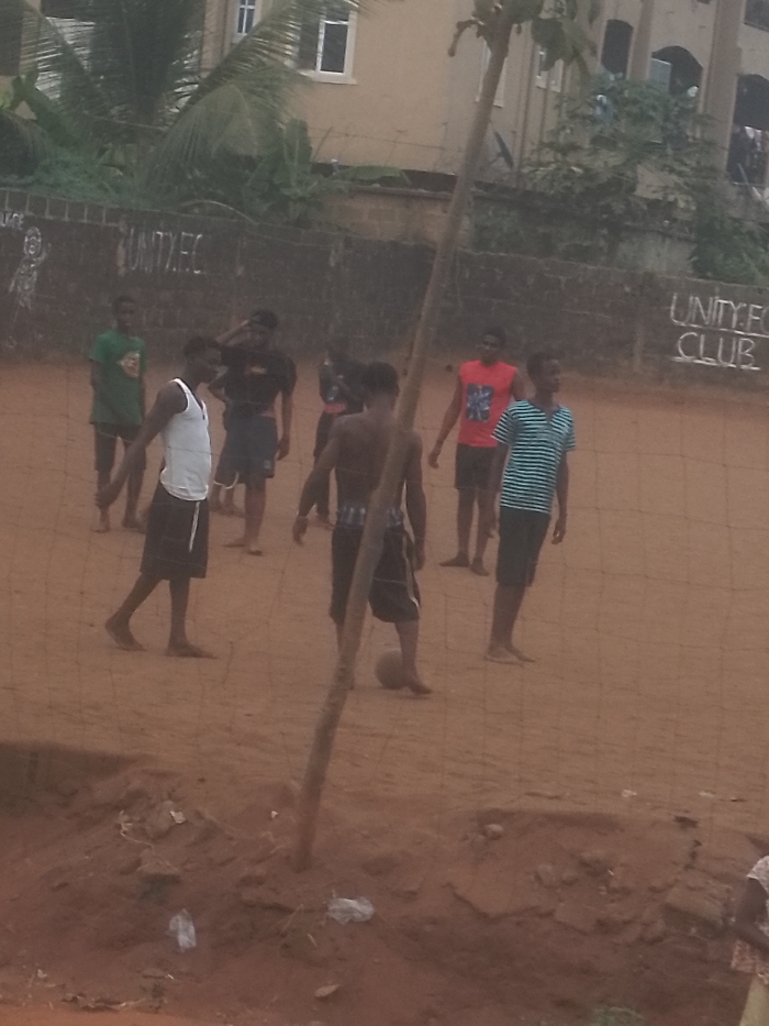 Several young men are playing barefoot on a dusty soccer field. They are near a short brick wall with "UNITY FC" and "UNITY CLUB" painted on it. A net is visible, supported by a wooden pole. In the background, there's a building with a few windows and lush green foliage. In the foreground, trash litters the ground.