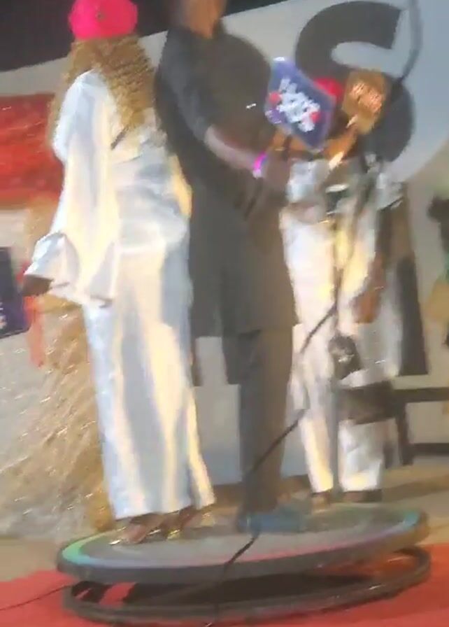 A group of people stand on a rotating platform taking pictures. The platform sits on a red rug. Behind them is a large Christmas snowman decoration covered in glittering fabric. One person wears a white outfit with a pink turban. Another person wears a dark outfit with a black hat. The people are holding signs in their hands. One sign says "I Love JOS." The environment appears to be an event or party, with decorations in the background.