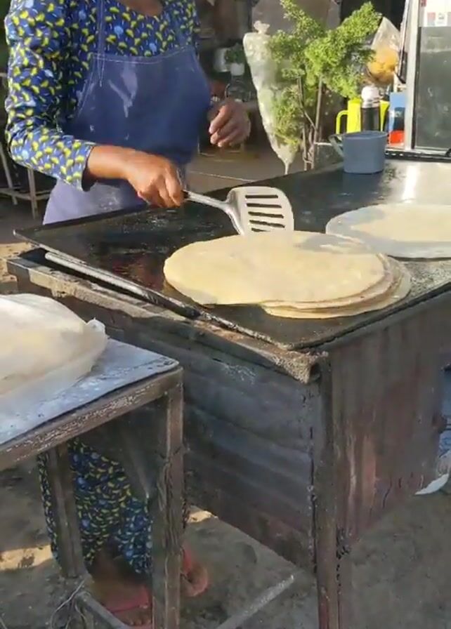 A young woman wearing a blue and yellow patterned dress, a blue apron, and a black baseball cap is outdoors, operating a flat-top grill. She stands behind a worn, metal cooking station and uses a slotted spatula to flip flatbreads stacked on the grill. To her left, on a small metal table, is a stack of uncooked flatbreads in a plastic bag. Behind her, there's a plant, a yellow thermos, a grey mug, and a refrigerator. The scene appears to be a street food vendor setup.