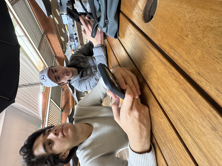 The image depicts two young adult males seated at a slatted wooden table in an open-air or semi-enclosed dining area, likely a food court or restaurant terrace within a commercial complex in Mexico City, Mexico. In the foreground, on the left, a male with dark, wavy hair, wearing a light grey knitted sweater, is seen from the chest up, looking upward and to the left of the frame. Both his hands are holding a dark-cased smartphone on the table, with his thumbs positioned on the screen. In the mid-ground, on the right, another male, wearing a grey puffer jacket and a light grey baseball cap with a dark Mercedes-Benz logo, is visible from the waist up. He has short dark hair visible under the cap and is looking directly towards the viewer. He holds a dark smartphone in his left hand, resting his right forearm on the table. On the table, to the right of the male in the puffer jacket, a grey duffel-style bag or small backpack is present, alongside a clear plastic bottle labeled "WATER" with additional text "MATTERS" visible below. The wooden table features a smooth, polished finish and a circular hole on the right side, likely for an umbrella pole. Overhead, a portion of a large black outdoor umbrella is visible. The background reveals a commercial environment with other tables and dark umbrellas. Architectural elements include reddish-brown exposed brick walls and a ceiling structure comprising parallel dark beams, white translucent panels, and an overhead slatted roof design. Further in the background, brightly lit counters suggestive of food stalls or restaurants are discernible. The lighting indicates a daytime setting.