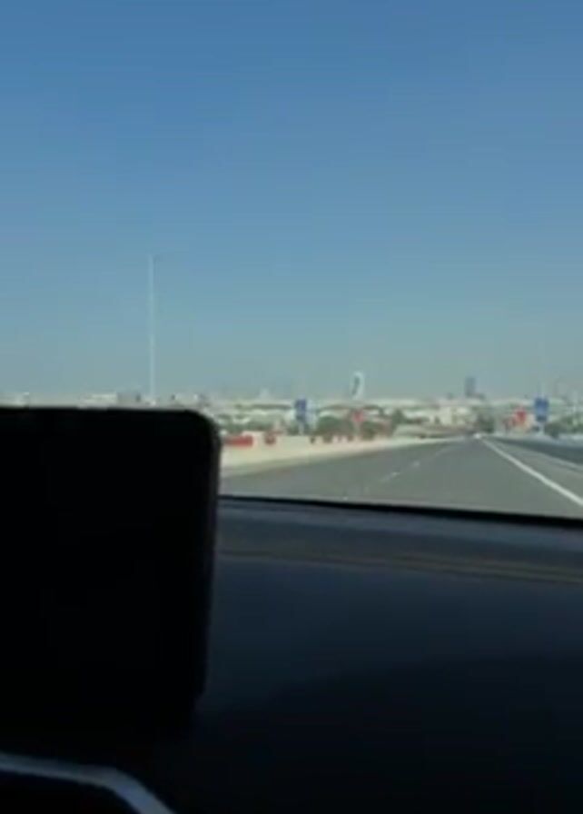 The video appears to be shot from inside a car, looking out at a highway. The sky is clear and blue. In the distance, a city skyline is visible, appearing somewhat hazy. The road in front has barriers and road signs on both sides. The car's dashboard is visible in the foreground, with a screen and other interior elements present. A vehicle is in motion.