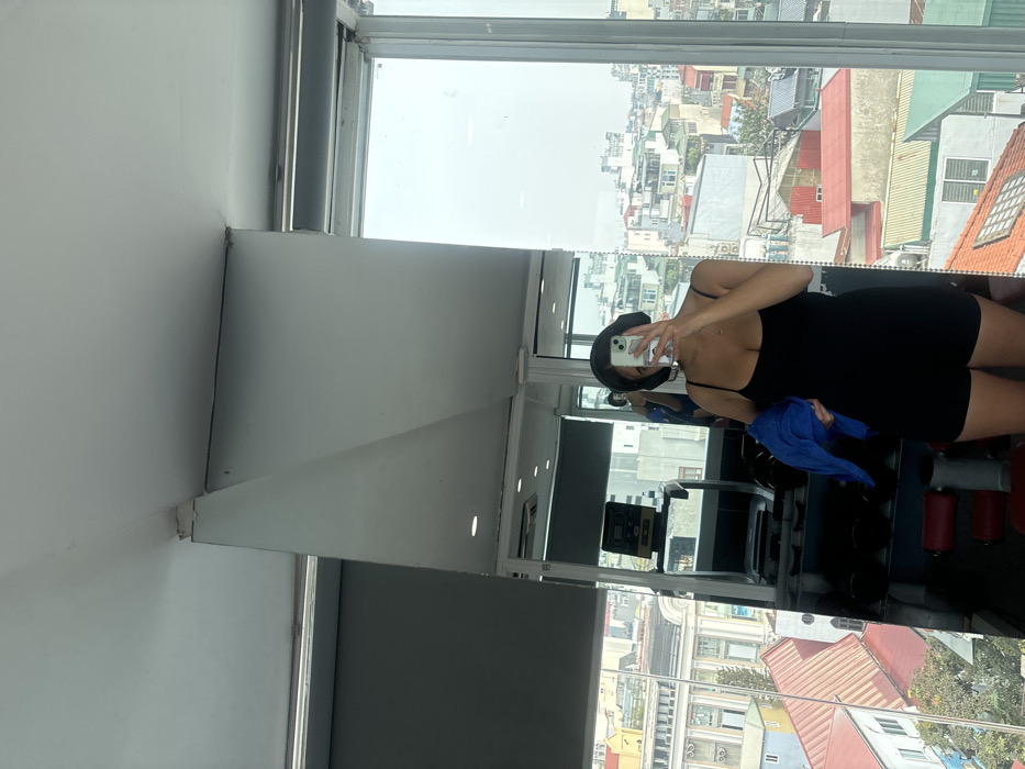 A person in a black bodysuit and hat takes a mirror selfie in a gym. The reflection shows exercise equipment and a city view through a large window. The person holds a blue towel. The background city has dense housing with varying roof colors.