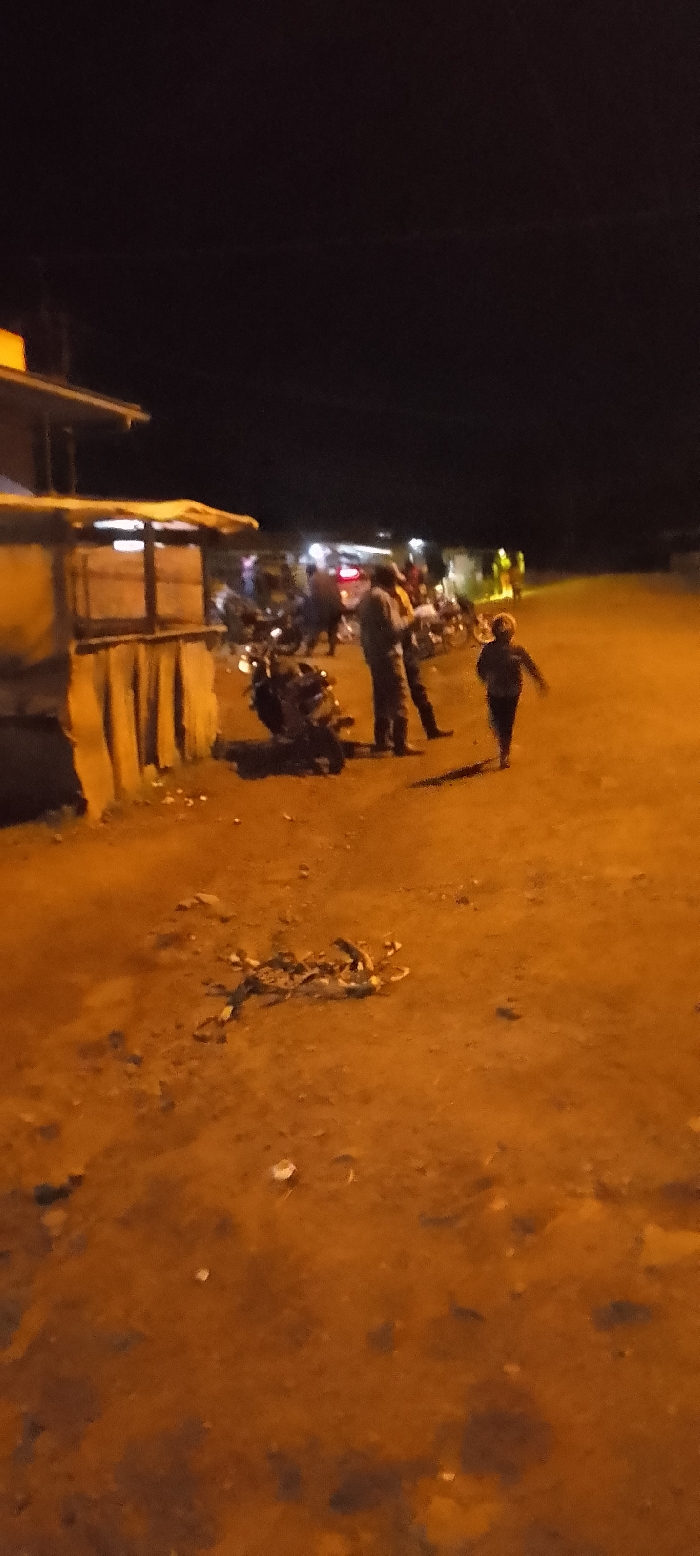 It is nighttime, and the location appears to be an outdoor area near a building or structure with a simple roof. A small group of people are gathered nearby, one of whom is walking away from the group. A motorcycle is parked, and there is some debris or discarded items on the ground. The overall lighting is dim, with the scene illuminated by streetlights and other light sources. The ground is mostly dirt or gravel, contributing to the somewhat rugged or underdeveloped look.