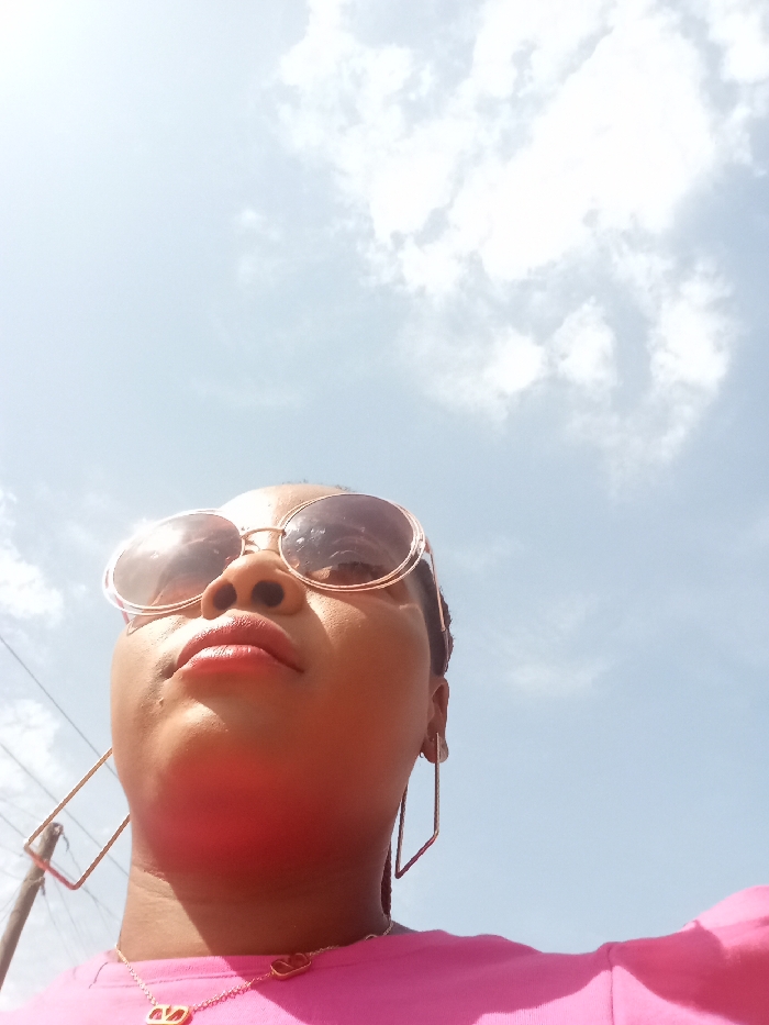 A low-angle shot captures an individual in Sabon Tasha, Nigeria, under a bright sky with scattered white clouds. The subject, appearing to be an adult female with brown skin, is positioned in the lower portion of the frame, looking upward. She wears oversized, round-frame sunglasses with amber-tinted lenses and a gold-colored frame, reflecting direct sunlight. Her lips are closed and appear to have a reddish tint. Prominent gold-colored, rectangular hoop earrings are visible on both ears. Around her neck, a thin, gold-colored chain necklace with a "V" shaped pendant is visible. She is wearing a bright pink garment, possibly a t-shirt or top, partially visible on her shoulders and chest. In the lower-left background, a dark, slender utility pole or post is partially visible. No other individuals or significant objects are present in the immediate vicinity.