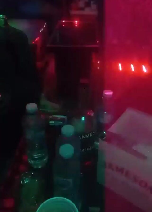 table with a bottle of Jameson Black Barrel whiskey, several bottles of water, a red Solo cup with a dark liquid and ice in it, and a Jameson ice bucket. The table is dark and lit with blue and red light, suggesting a club or bar atmosphere. In the background, there are blurred figures of people dancing or moving around. A person briefly appears in the foreground, passing by the table. The audio suggests music is playing.